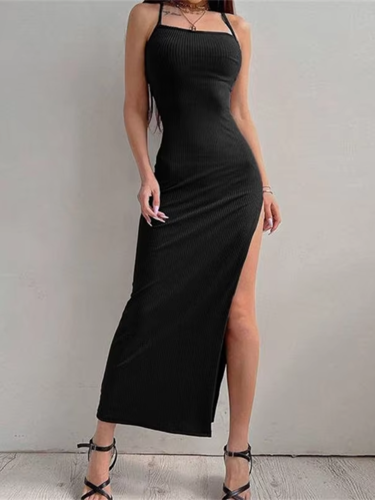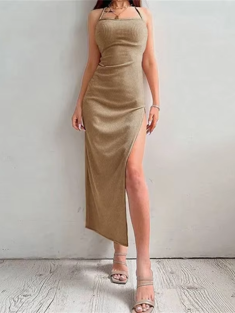 - Spacco laterale alto: esalta il movimento e aggiunge un tocco sensuale alla silhouette elegante dell'abito.