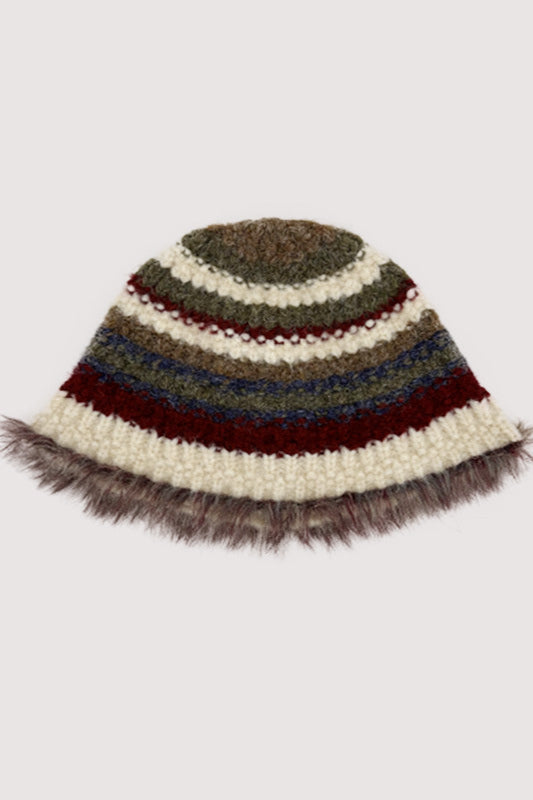 Completa il tuo outfit con il nostro cappello a secchiello lavorato a maglia a righe, un accessorio giocoso che unisce il fascino classico alla morbida texture della maglia. Caratterizzato da strisce colorate e una finitura pelosa, questo cappello è perfetto per aggiungere un tocco di fantasia e calore ai tuoi look autunnali e invernali.
