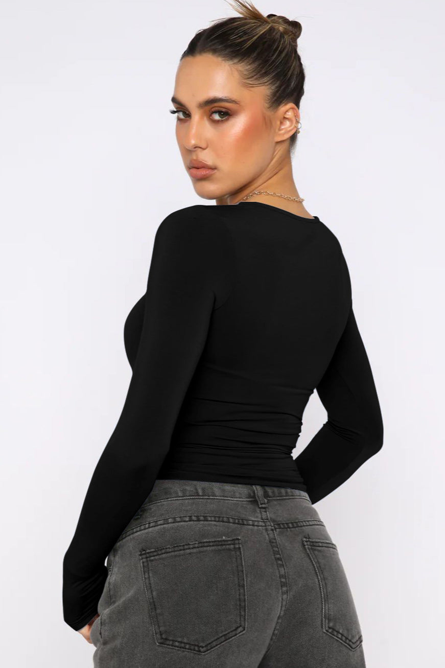 Cattura l'attenzione con questo top aderente a maniche lunghe con scollo rotondo nell'intramontabile nero, pensato per valorizzare la tua silhouette con un look elegante e moderno. Che tu voglia vestirti elegante o casual, questo top essenziale unisce perfettamente eleganza e versatilità per ogni occasione.